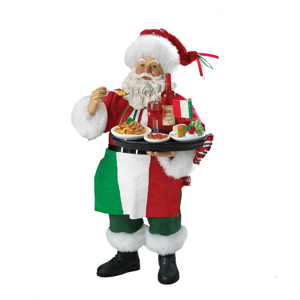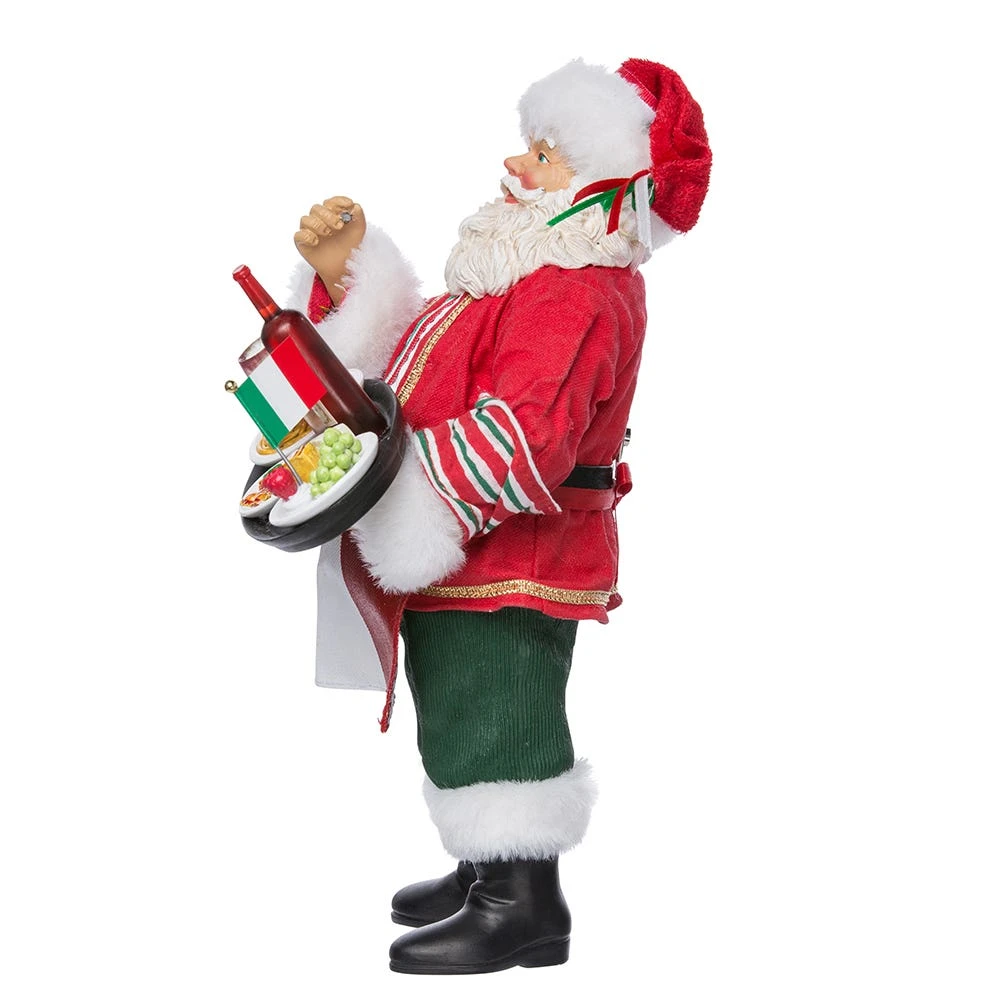 Add to your holiday décor while displaying Italian pride with this 10.5″ Musical Italian Santa from Kurt Adler’s Fabriché’ collection. Santa Claus is featured here wearing the Italian flag colors of red, green, and white, and is holding a large tray of Italian food and wine. This musical piece plays the classic tune, “Funiculi Funicula.”