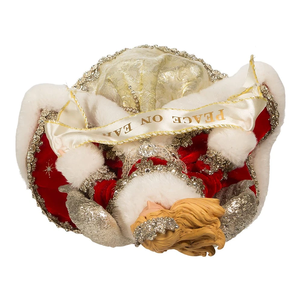 Add a classic touch to your Christmas tree with 10-inch Fabriché™ regal red angel treetop from Kurt Adler. This beautiful angel treetop features a stunning angel dressed in a regal red robe with silver and clear gemstone embellishments and white fur trim. she is holding a “Peace On Earth” banner.