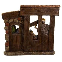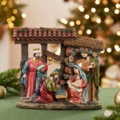 Celebrate and remember the true meaning of Christmas with this 10-Inch Resin Nativity Scene Table Piece from Kurt Adler. This piece features a wooden stable design and stationary characters from the nativity scene in intricate detail. Figures include, the Holy Family, the Three Wise Men, an angel, a shepherd and a cow.
