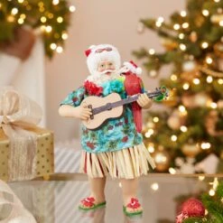 Part of Kurt Adler’s Fabriché’ collection, this 11″ Fabriché’ Beach Santa is a fun and festive addition to any holiday décor. Santa Claus is featured here ready for a day at the beach, with a Hawaiian shirt, grass skirt, guitar, and parrot buddy. Of course, he is also wearing his signature red and white hat.