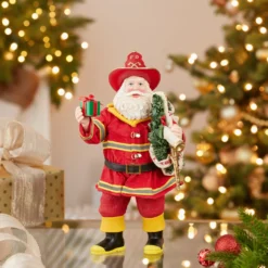 Part of Kurt Adler’s Fabriché™ collection, the 11-Inch Fabriché Fireman Santa with Wreath and Hose is a festive holiday decoration featuring a fireman Santa Claus figure. The Santa is dressed in a traditional fireman’s uniform, complete with a red and gold coat, black boots, and a fireman’s hat. He is holding a gift in one hand and in the other is a holiday wreath wrapped with a “Merry Christmas” fireman’s hose. The intricate details make this figurine a truly unique and special addition to your holiday décor. It stands at 11 inches tall, making it the perfect size for display on a mantel, tabletop, or shelf. This unique and charming decoration is sure to bring cheer and joy to any holiday setting.