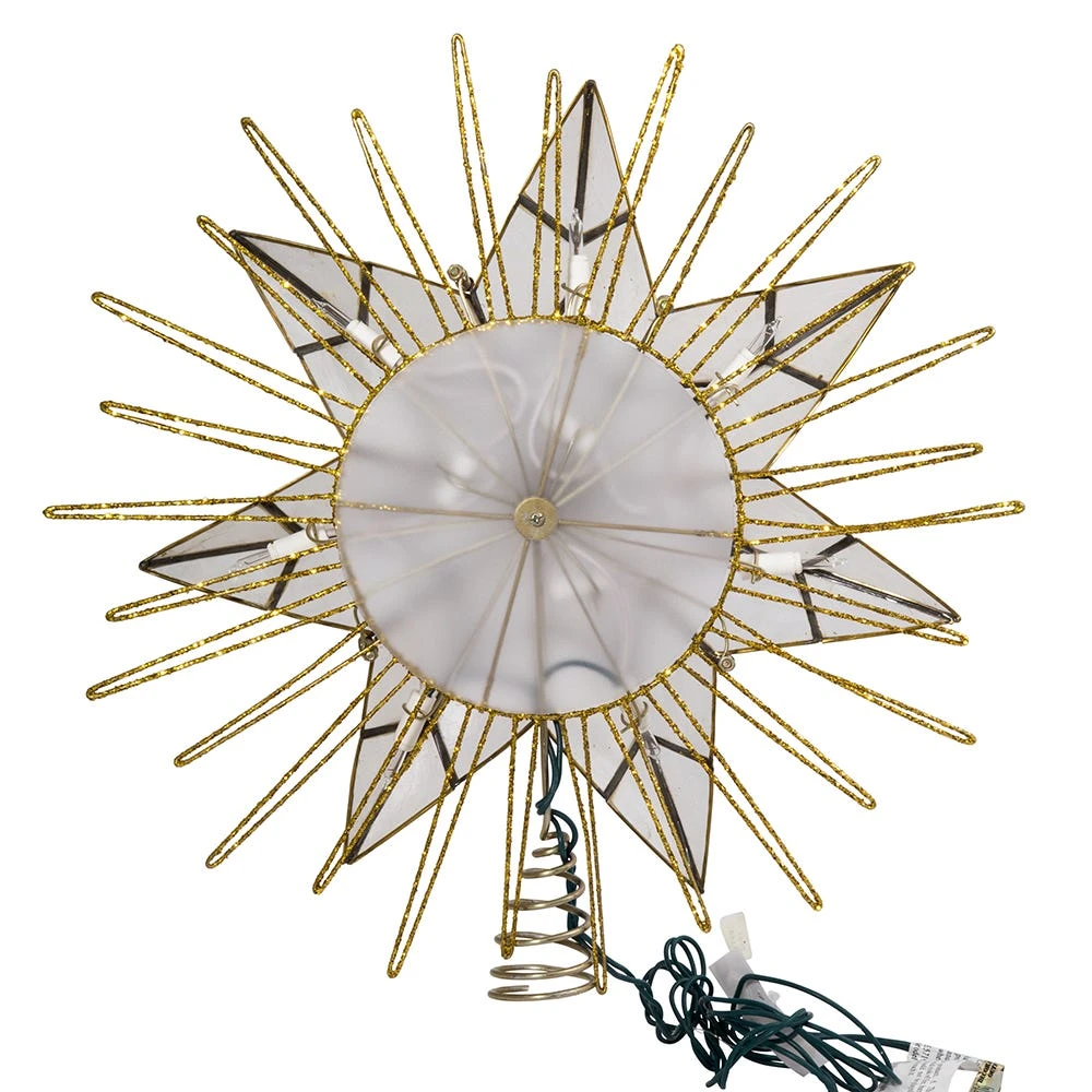 This 14″ 7-Point Natural Capiz Star Lighted Treetop by Kurt Adler is a beautiful, classic way to accent the lighting and décor of your Christmas tree. Featuring a large 7-point star design framed by several surrounding wire ray accents, this bright star has a glittery gold-plated finish. Includes 4 spare bulbs and 2 spare fuses.