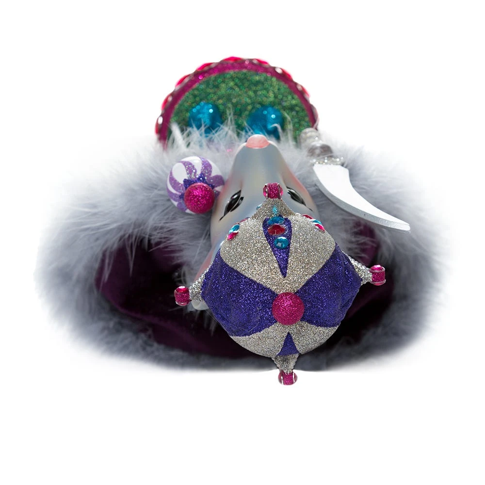 Hollywood Nutcrackers is a whimsical collection of nutcrackers created exclusively for Kurt S. Adler, Inc. and features an assortment of designs that put a unique, vibrant, memorable twist on traditional nutcrackers. This 15-Inch Hollywood Mouse King Nutcracker is a fun and festive addition to any holiday decor or nutcracker collection. Featuring the Mouse King from the Nutcracker, this piece has rich, vibrant shades of purple, blue, and magenta. His sweet gray face is topped with a matching crown embellished with gems. To complete his look, he is holding a sword and a staff.