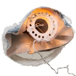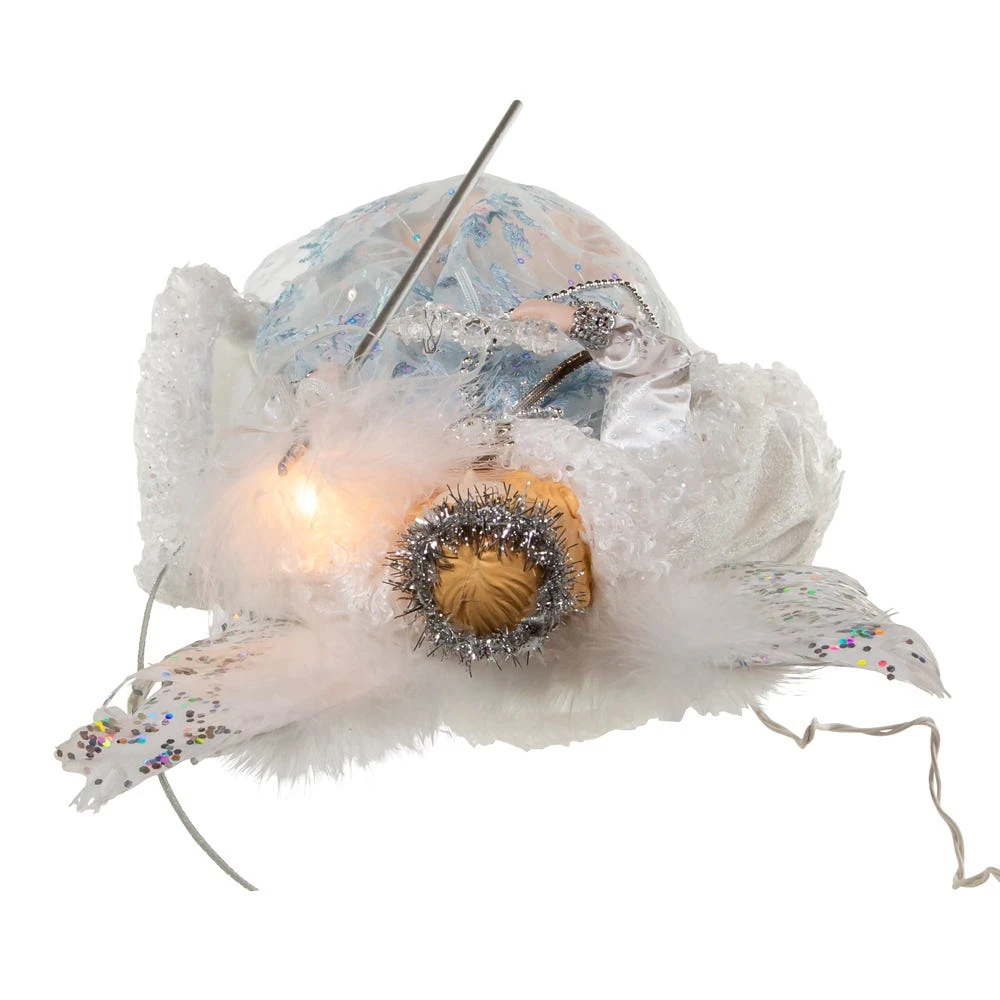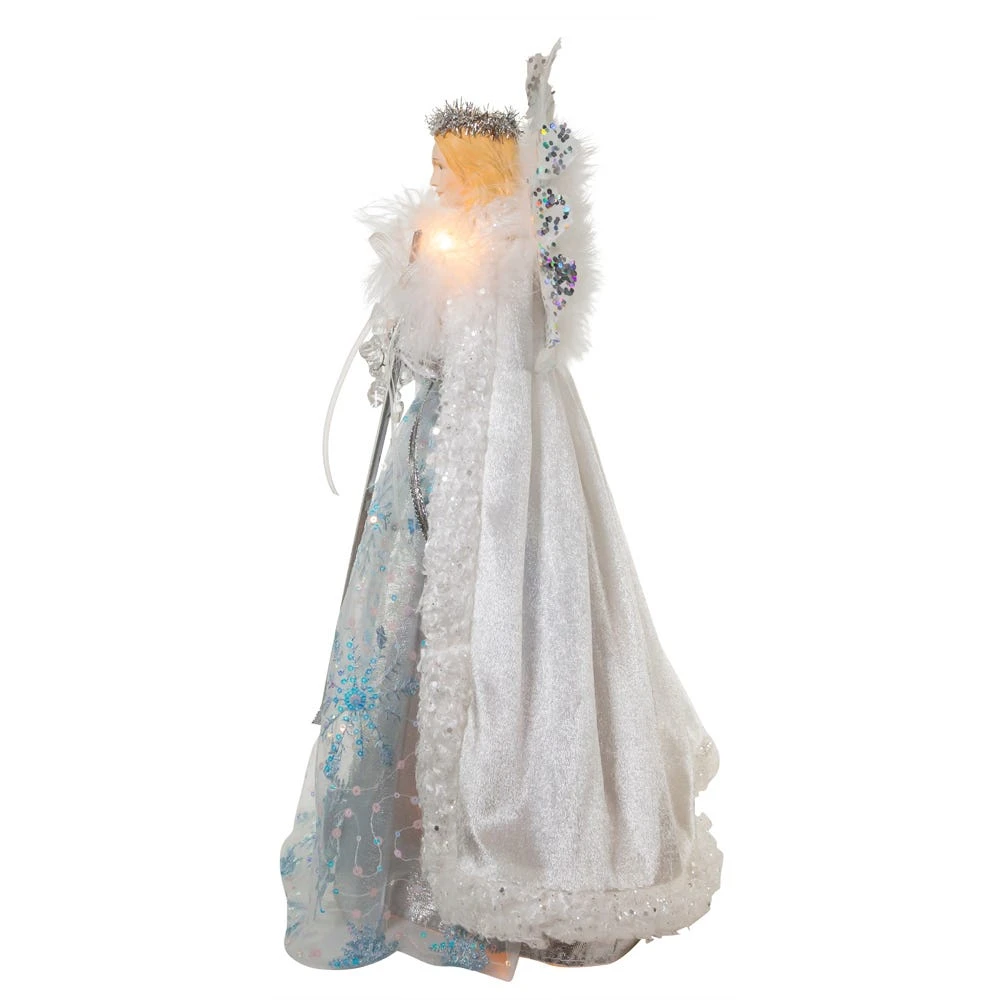 The 16-Inch White/Silver/Lavender And Blue Angel Tree topper features an angel wearing a white dress decorated with lavender blue iridescent sequined snowflake pattern with iridescent silver glittered white wings. In her hand she is holding a snowflake topped staff and when plugged in she is pre-lit by 10 clear incandescent bulbs.