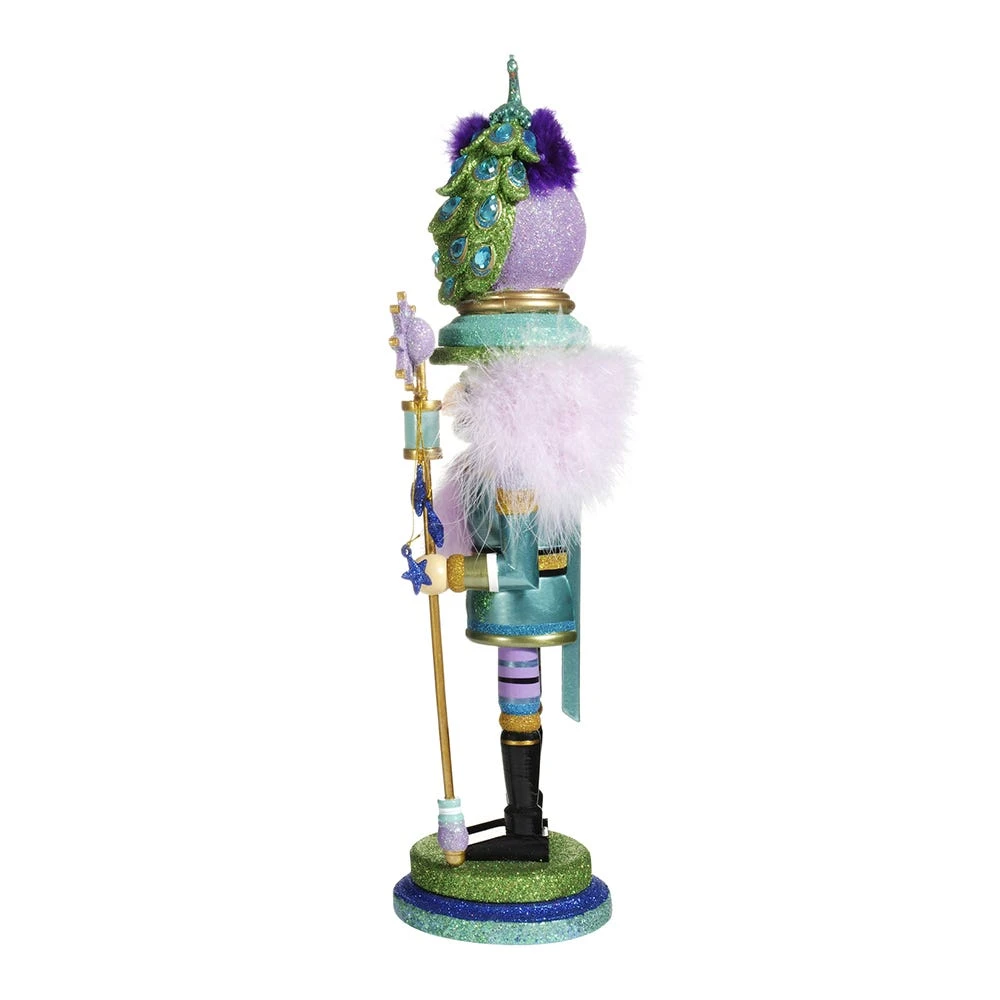Hollywood™ Nutcrackers is a whimsical collection of nutcrackers created exclusively for Kurt S. Adler, Inc. and features an assortment of designs that put a unique, vibrant, memorable twist on traditional nutcrackers. Add a peacock theme to your home with this 17.5-Inch Peacock Hat Nutcracker. This nutcracker features blue, purple, green, and gold detailing. Topped off with a peacock perched on the hat, this nutcracker is a stunning addition to any holiday décor.