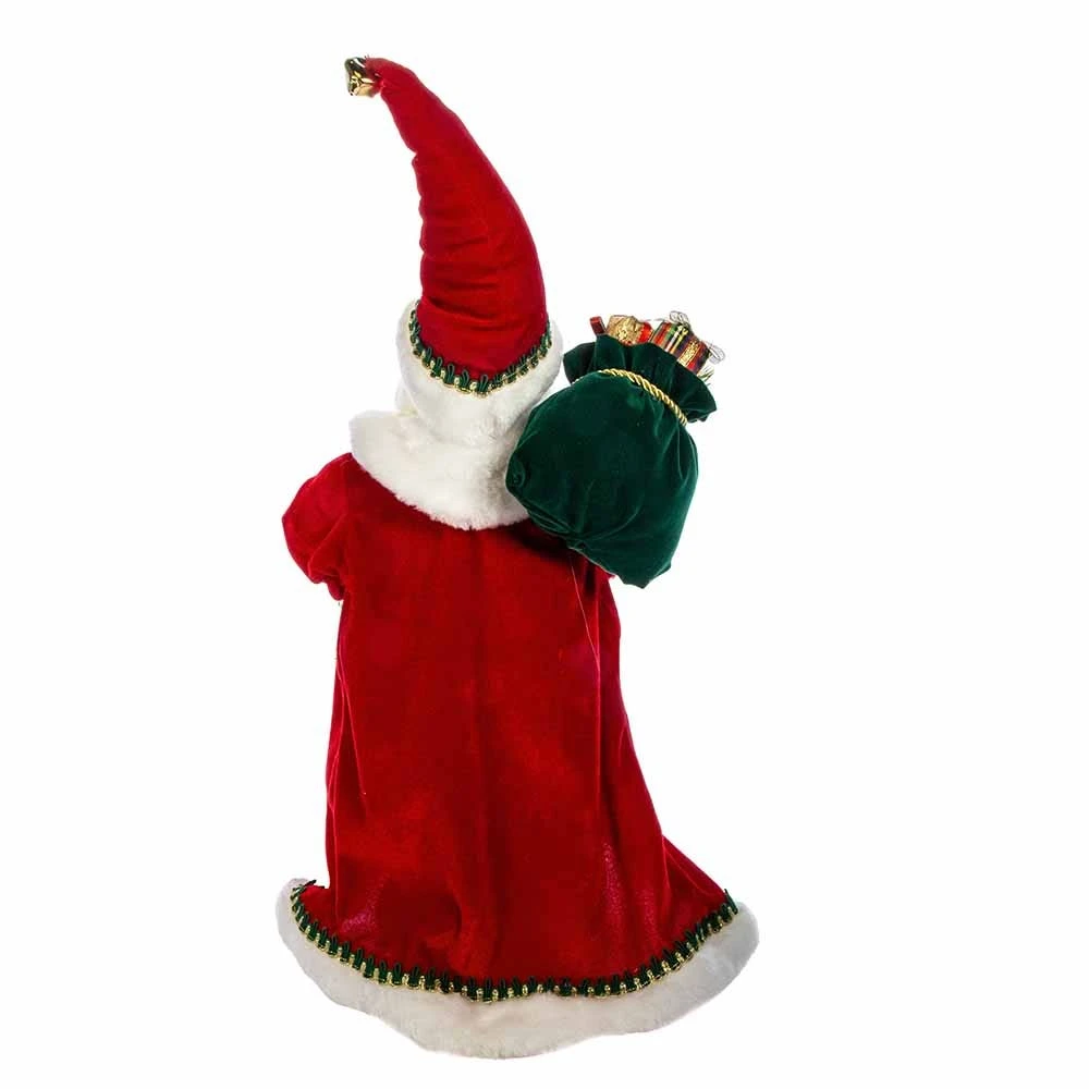 This 17-Inch Kringle Klaus Fancy Santa with Stocking from Kurt Adler is a fun and festive addition to any holiday décor. Part of the Kringle Klaus collection, Santa is featured here wearing a red and white robe with a green and gold vest. In one hand he is holding a red, green and gold brocade stocking filled with presents and greenery and over his shoulder he is holding a green velvet bag filled with greenery and decorated presents.