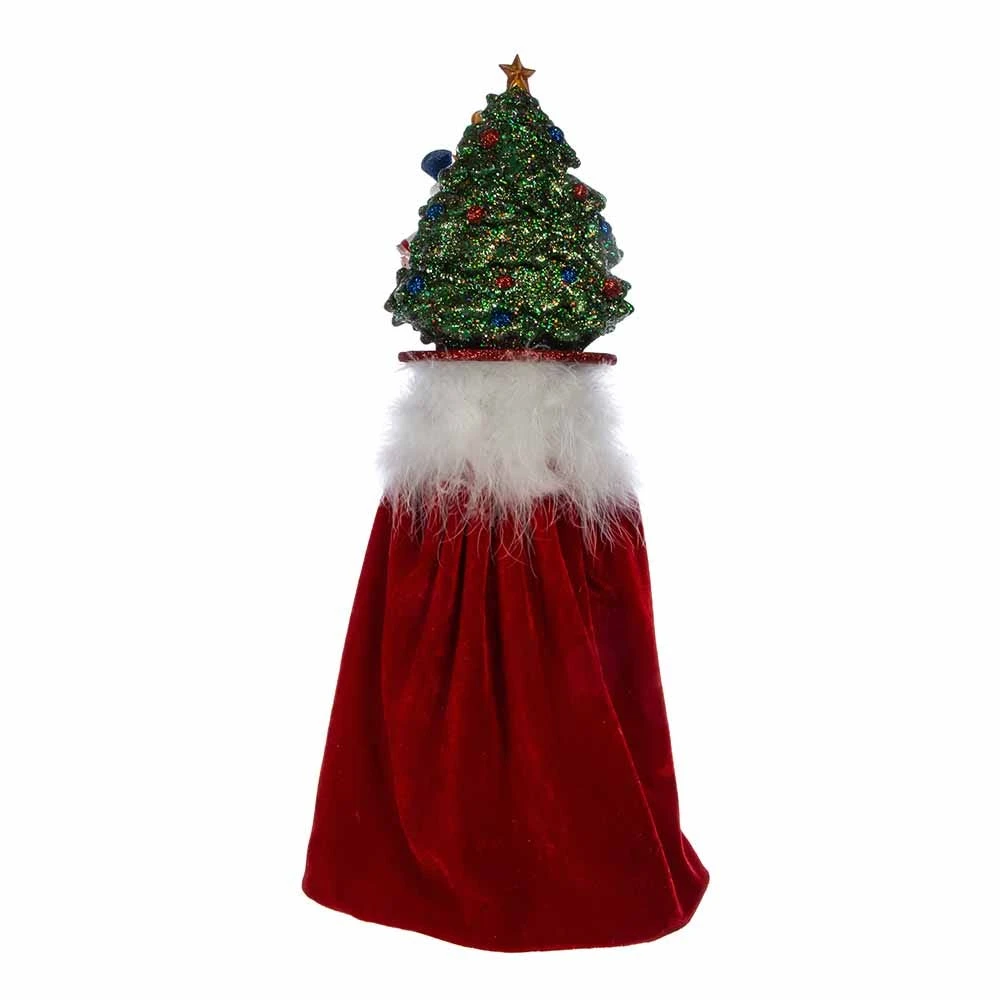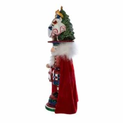 Hollywood Nutcrackers is a whimsical collection of nutcrackers created exclusively for Kurt S. Adler, Inc. and features an assortment of designs that put a unique, vibrant, memorable twist on traditional nutcrackers. This 18-Inch Hollywood Clara Hat Nutcracker from Kurt Adler is a fun and festive addition to any holiday décor or nutcracker collection. The hat features Clara from the Nutcracker, wearing a lovely white dress with pink and red embellishments around the skirt. She is holding her own glittered miniature Nutcracker Prince, as she dances around a decorated Christmas tree. The nutcracker is wearing a green and red glittered outfit with a red velvet cape and is standing on a red and green glittered base with red and green gemstones.