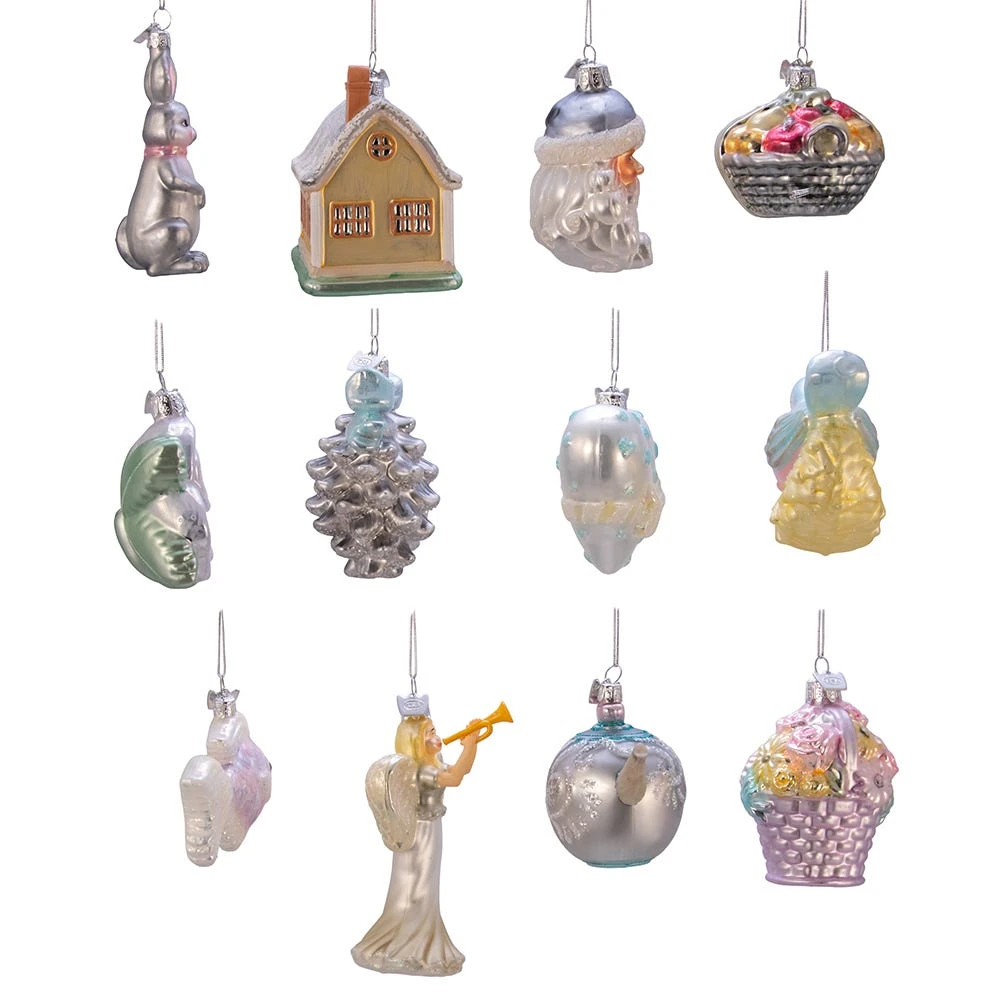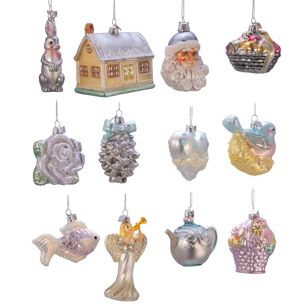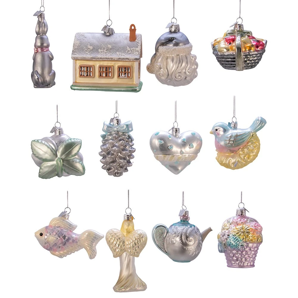This Noble Gems™ Newlywed’s Glass Tree Box is a gorgeous addition to any holiday décor or Christmas tree. This set features a bunny, a house, Santa Claus, a basket of fruits, a rose, a basket of flowers, a heart, a bird in nest, a fish, an angel playing the trumpet, a teapot, and an acorn. This set is the perfect gift for newlyweds.