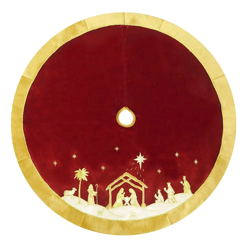 This 48-Inch Red and Gold Religious Tree Skirt by Kurt Adler is a fun and festive addition to any holiday décor. Its bold red color and gold border is accented with a classic nativity scene with the Holy Family in the center. This treeskirt features rich hand embroidery detailing throughout.