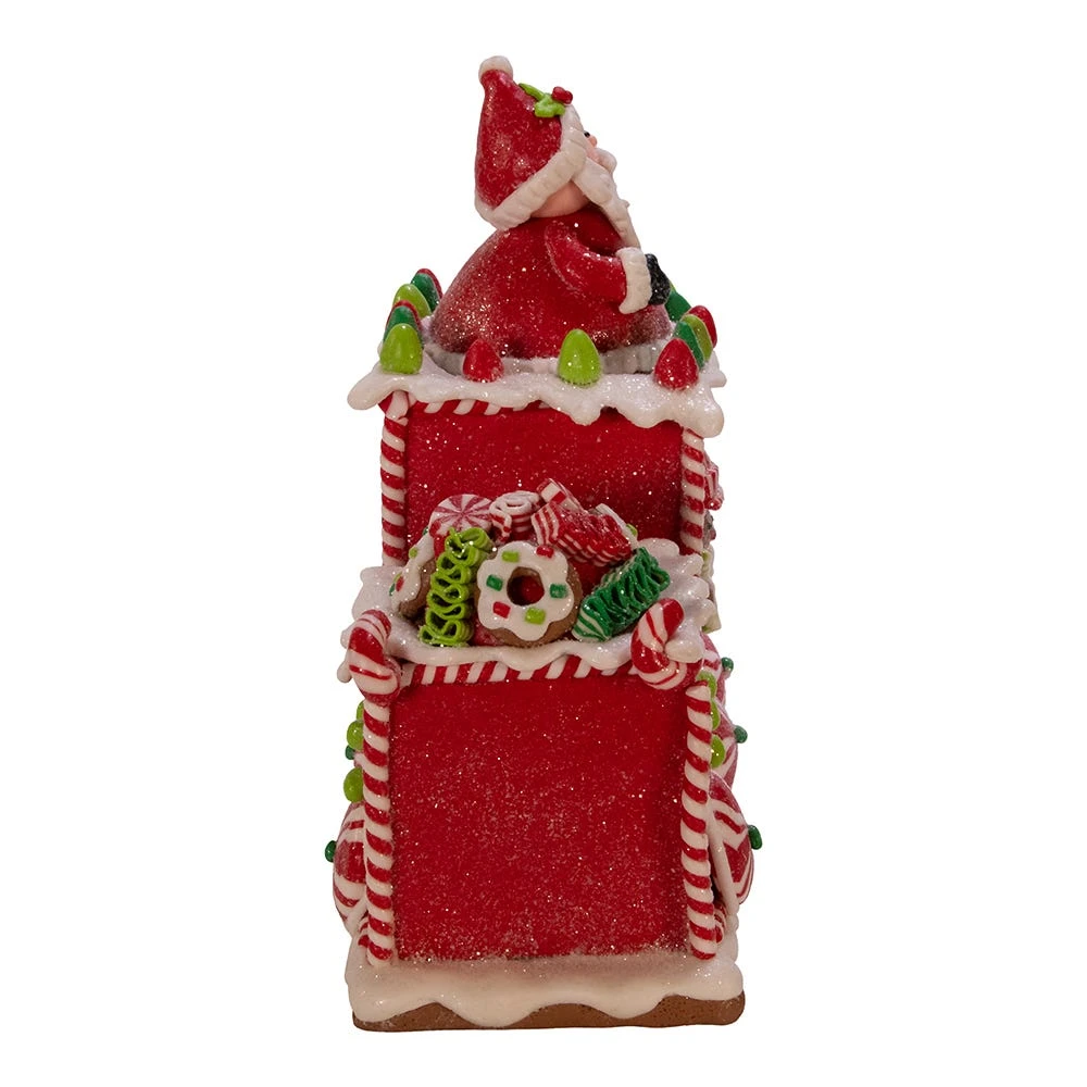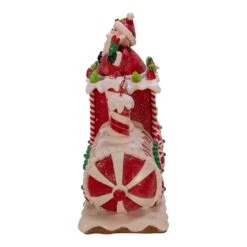 Add a sweet touch to your holiday décor with this 7.5-Inch Battery-Operated Gingerbread Junction LED Train Table Piece from Kurt Adler. This table piece features a locomotive and two train carts, with a candy design in mind. In one cart a gingerbread man is peeking from the window and Santa popping out from the top. Following close behind is a cart filled with various desserts.