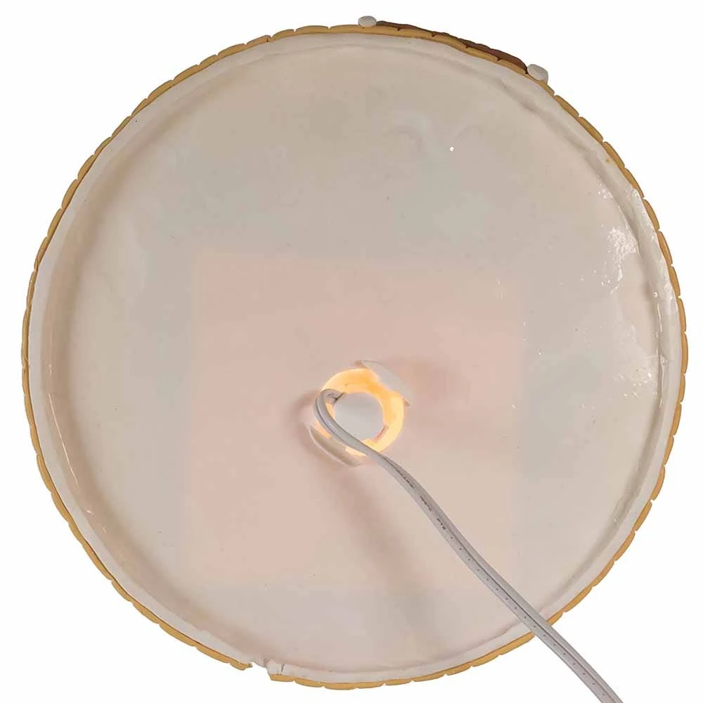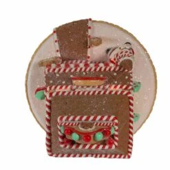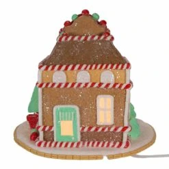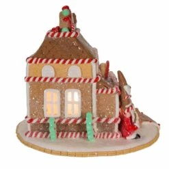 Add a fun classic touch to your holiday décor with this 7.5-Inch Lighted Gingerbread Shop from Kurt Adler. This table piece features a glittered snow covered gingerbread base, including Santa wearing a gingerbread cone hat, decorated gingerbread tree cookies and a gingerbread man. The gingerbread house is decorated with red and white peppermint candies, and white piping accents, It is glittered throughout for a sugared effect and when switched on, each window is illuminated from within by one C7 bulb.