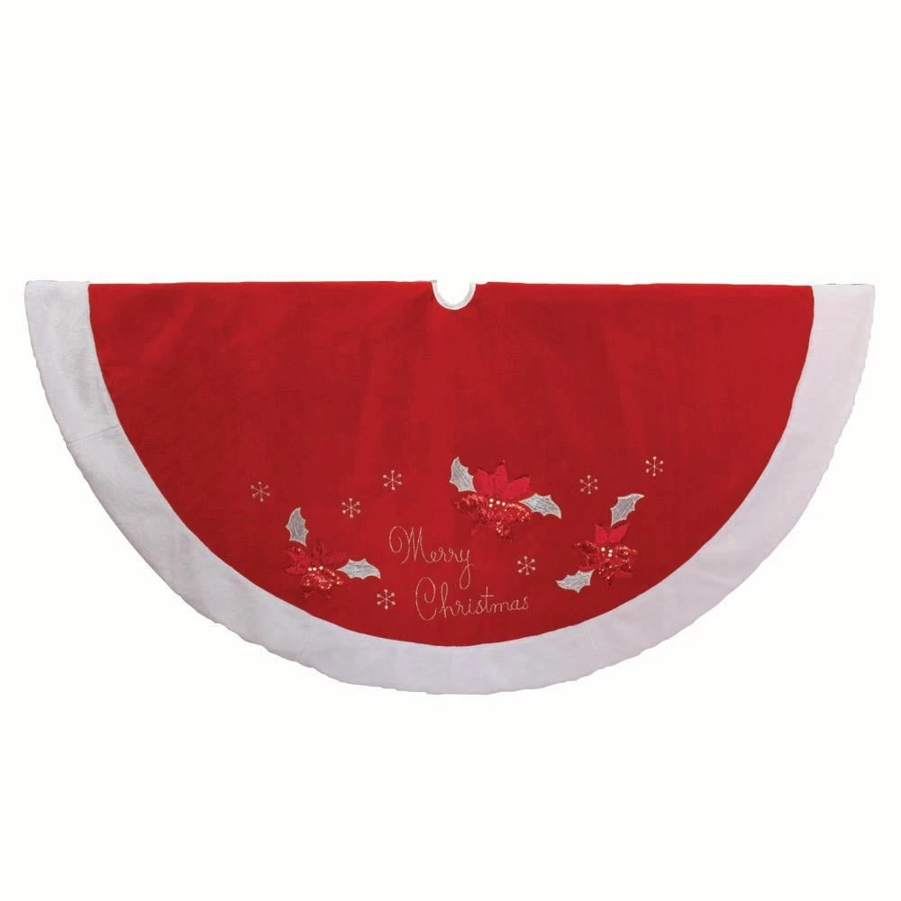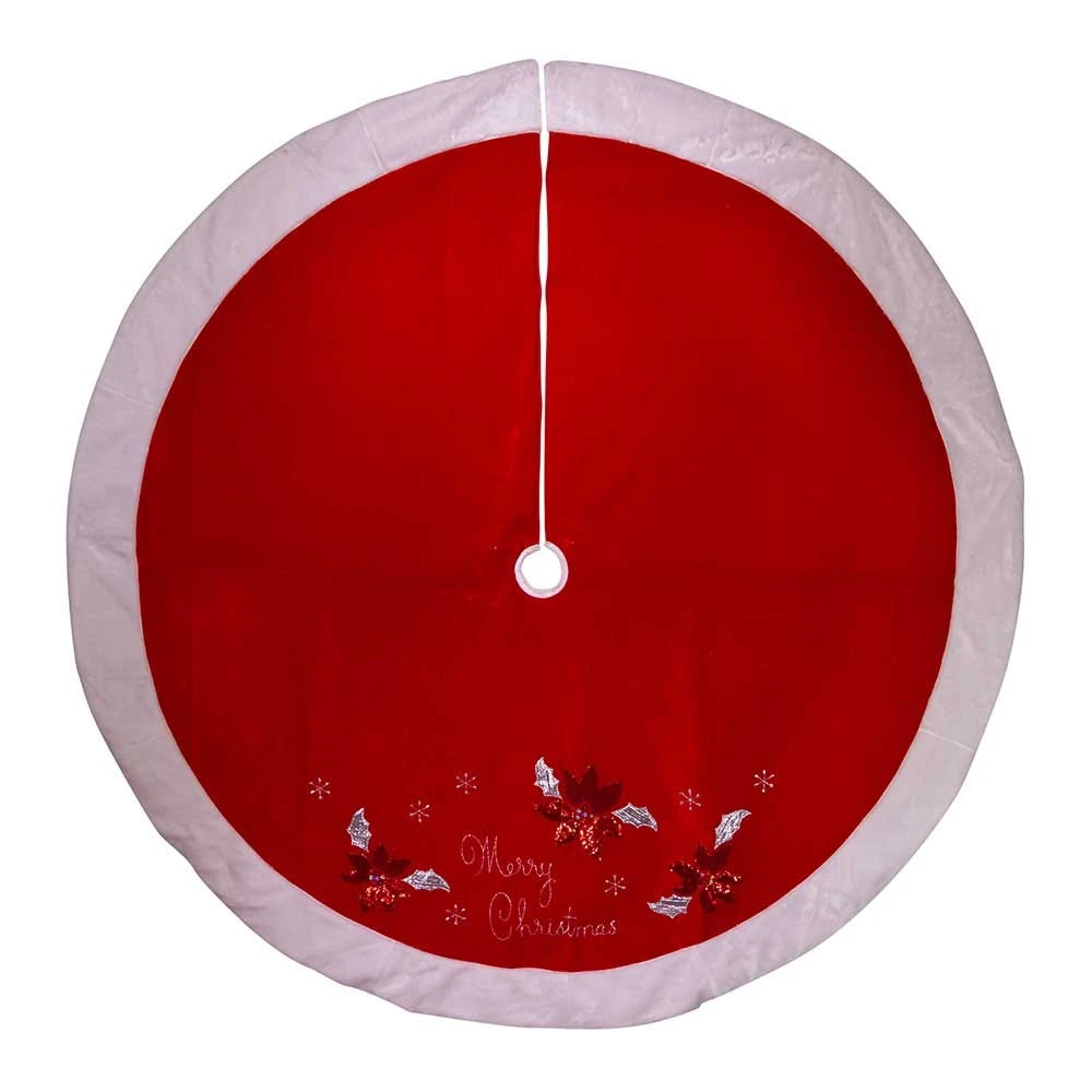 This 72-Inch Red and White Velvet Merry Christmas Applique Treeskirt from Kurt Adler is a fun and festive addition to any holiday décor. Its bold red color and white faux fur border is accented with a red and gold sequined poinsettia design, accompanied with the words “Merry Christmas” embroidered in gold. This is a perfect way to decorate your Christmas Tree!