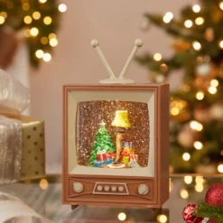 This 8.5-inch A Christmas Story Battery-Operated LED Musical Television Table Piece from Kurt Adler is a fun and festive addition to any holiday décor. This television water lantern features a vintage television with an antenna and a screen that displays the iconic leg lamp with a decorated Christmas tree and presents. When switched on, a spotlight falls on the leg lamp and glitter twirls around for a snowy scene. This item uses 3 AA batteries (not included) and plays 8 songs: Jingle bells, We Wish You a Merry Christmas, Silent Night, Deck the Halls, Joy to the World, The First Noel, Hark! The Herald Angels Sing & Oh Christmas Tree.