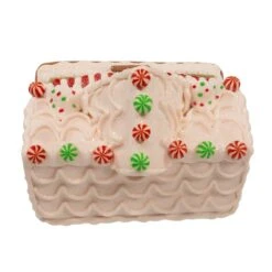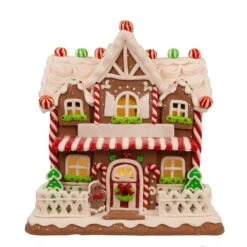 Add a sweet touch to your holiday décor with this 9-Inch Battery-Operated Light Up Two Floor Gingerbread House from Kurt Adler. Its beautifully detailed mansion-style design features candy cane and icing detailing, it is glittered for a sugared effect and each window is decorated with a holly and berry planter. This house is illuminated from within by 1 warm white 5mm LED, giving it a warm and cozy appearance. It has intricate details and is designed to look like a festive holiday dwelling. The gingerbread house is battery-operated, requiring 3 AA batteries, not included. This charming decoration is sure to bring some holiday cheer to any room or tabletop.