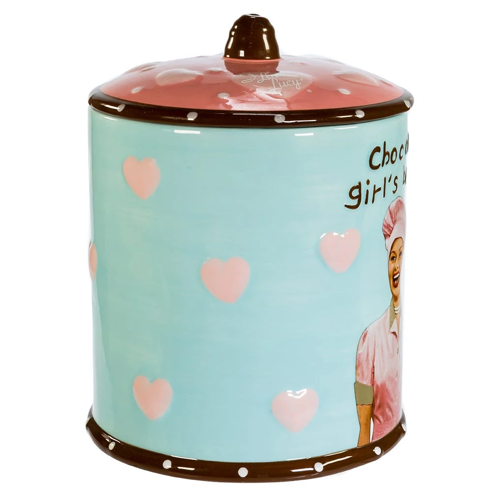 Store your cookies in retro-inspired style with this I Love Lucy® Cookie Jar from Kurt Adler! Perfect for fans of I Love Lucy®, this cookie jar is inspired by the chocolate factory episode and features Lucy and Ethel wearing their pink chocolate factory uniforms. The cookie jar reads, “Chocolate is a girl’s best friend!”