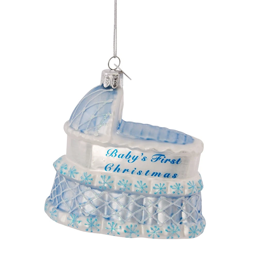 Celebrate your baby boy’s first Christmas with this 4-piece Noble Gems™ baby boy ornaments boxed set by Kurt Adler! These ornaments feature classic baby symbols including a pair of booties, a rocking horse, a rattle, and a bassinet in a delicate blue and white color scheme. Perfect for celebrating your baby boy’s first Christmas.